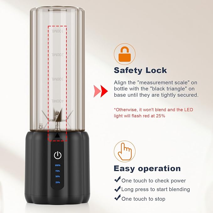 UPGRADED SAFETY LOCK SYSTEM: With our magnetic induction personal smoothie blender, easy to lock the blender on the go, and safe to rotate only when the bottle and base are tightly secured by align the "measurement scale" with the “triangle" on base