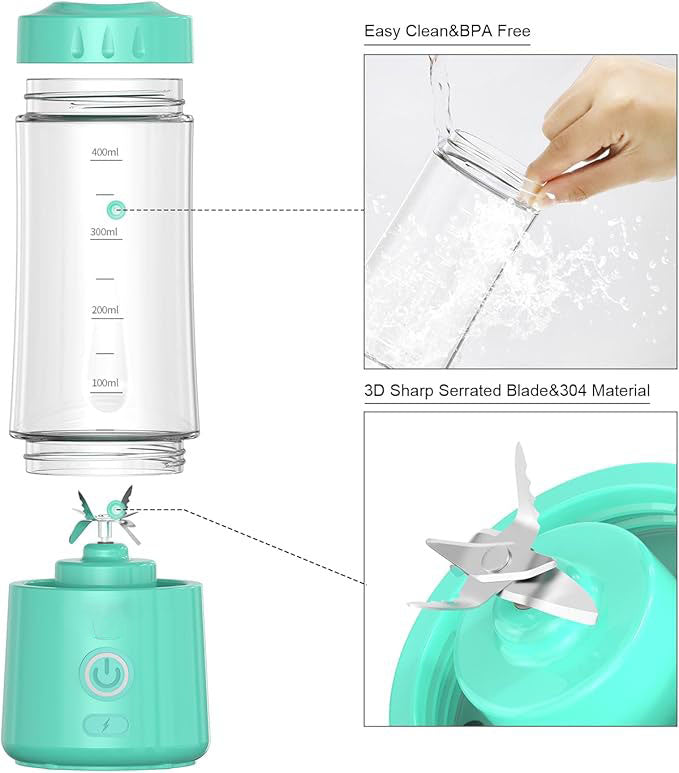 POWERFUL &EFFECTIVE-The Mini blender is equipped with 6 PCS 304 stainless steel blades and 7.4V motor. higher level of rotation frequency achieve 18000RPM, it only takes 30 seconds to bring you a cup of fresh smoothie, shakes, fresh juices, masks, baby food etc.